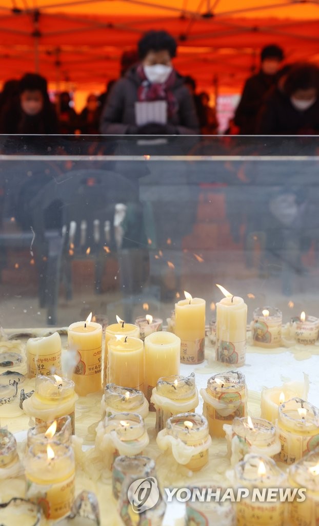 Parents and kin of college aspirants take part in a Buddhist prayer after offering lit candles to a Buddha statue in front of the main hall of Jogye Temple in Seoul on Dec. 2, 2020, to wish for their high scores on the state-administered annual scholastic aptitude test the next day. (Yonhap)