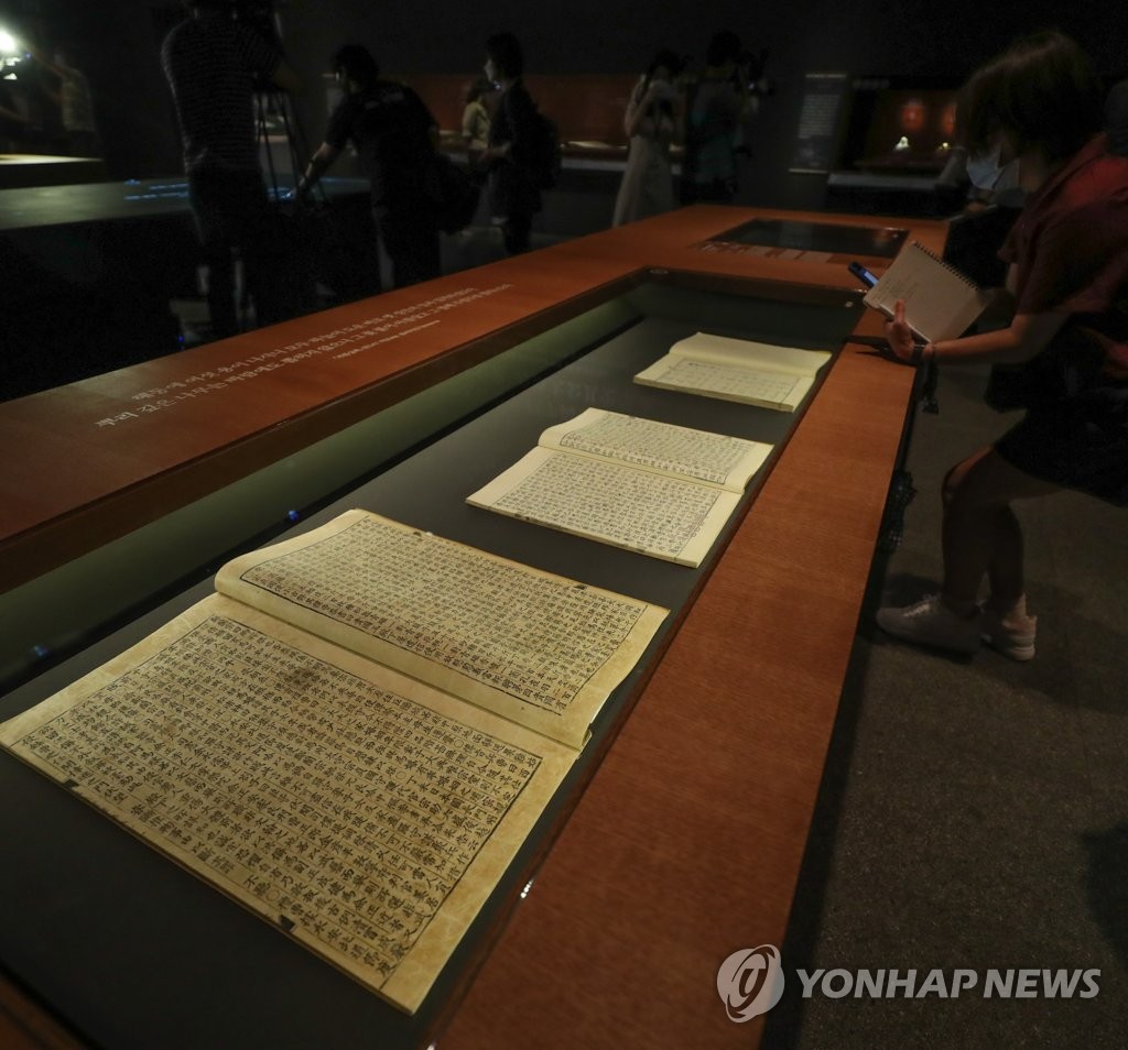 A visitor looks at the Annals of the Joseon Dynasty (1392-1910) during a press conference at the National Museum of Korea in Seoul on July 20, 2020, about a special exhibition introducing Korean cultural properties. The exhibition, which will open the next day and run through Sept. 27, features nearly 200 cultural items designated as treasures or national treasures from 2017 to 2019. (Yonhap)