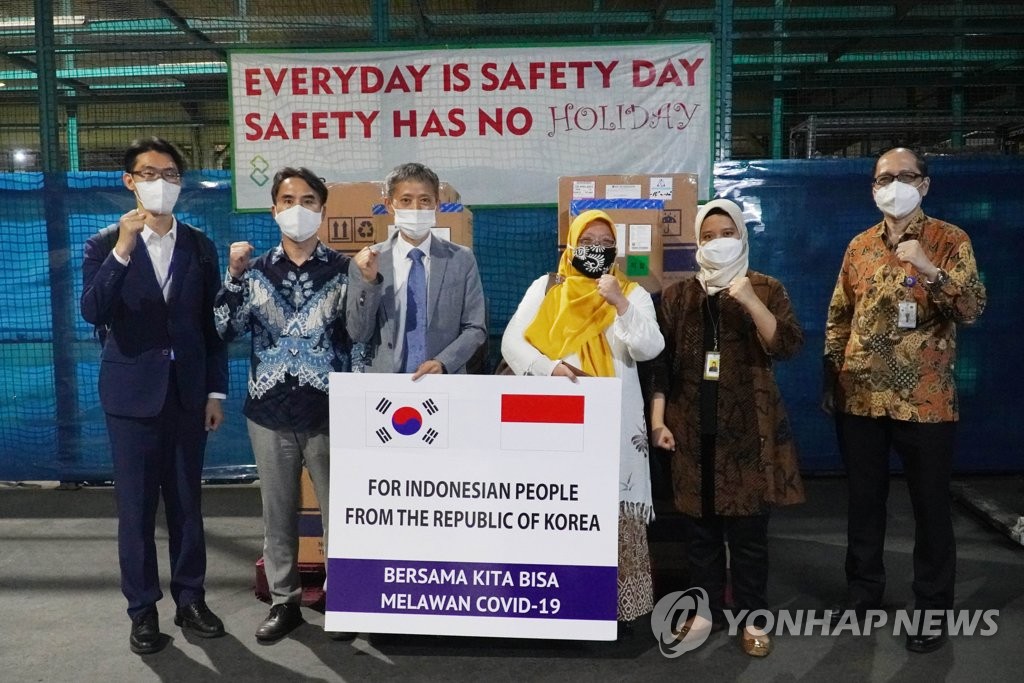 This photo, provided by the state-run Korea International Cooperation Agency, shows a ceremony on Oct. 1, 2021, to convey test kits worth US$100 million to Indonesia to help overcome the COVID-19 pandemic. (PHOTO NOT FOR SALE) (Yonhap)