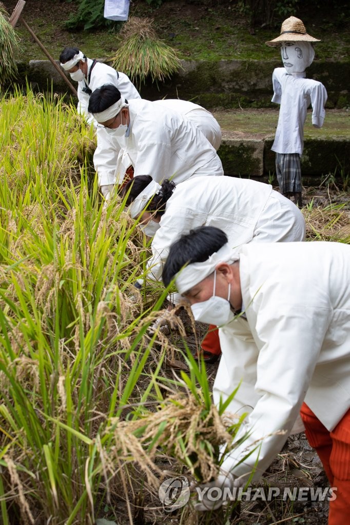 People dressed like Korean farmers attend an event to harvest rice from a rice paddy at Seoul's Changdeok Palace, a Joseon Dynasty (1392-1910) royal palace, on Oct. 12, 2021. Joseon Dynasty kings used to transplant rice seedlings in the paddy to ascertain crop quality and estimate the size of the kingdom's crops. (Pool photo) (Yonhap)