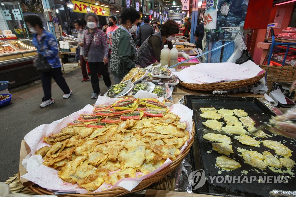 Shoppers walk past a shop selling "jeon," or Korean-style pan-fried pancakes and one of the popular offerings for Korean holiday rituals, at a traditional market in the city of Nonsan, South Chungcheong Province, central South Korea, on Sept. 28, 2020, two days ahead of Chuseok, the Korean harvest holiday that falls on Oct. 1 this year and is part of a five-day break. (Yonhap)