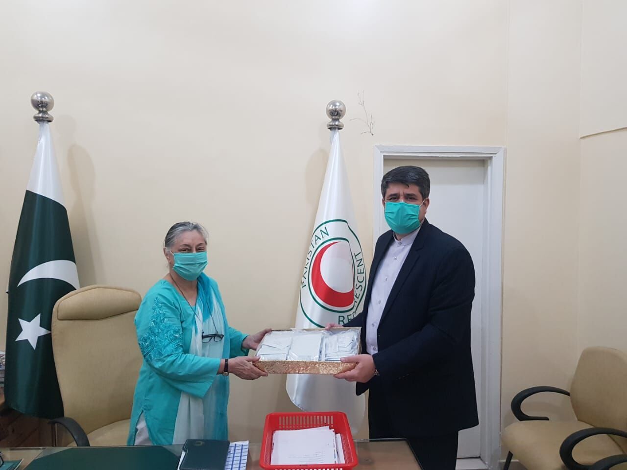 Islamabad, July 23, IRNA -- Consul General of the Islamic Republic of Iran in Pakistan’s Karachi handed over hundreds of corona safety kits to the Red Crescent society in southern Sindh province. Ahmad Mohammadi handed over the safety gear to the women head of Red Crescent society in Sindh, Shahnaz Hameed during a meeting in Karachi on Thursday. The two sides during the meeting, which took place at the Red Crescent office in Sindh, exchanged views on the outbreak of coronavirus in Iran and Pakistan. Iranian diplomat said that Iran is producing state of the art anti-corona safety equipment along with medicines and is ready to supply and export these products to Pakistan on affordable prices. Mohammadi on the occasion handed over hundreds of corona safety kits to Sindh Red Crescent society on behalf of a renowned Iranian hospital. It is pertinent to mention that in March this year Pakistan’s largest philanthropic Edhi foundation had donated US $200,000 to Iran to assist the country in the fight against coronavirus. Head of the organization Faisal Edhi handed over the donations to Iranian Consul General in Karachi, at the consulate.