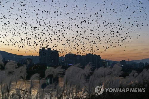 A flock of crows flies over the Taehwa River in the southeastern industrial city of Ulsan on Nov. 6, 2017. (Yonhap) (END)