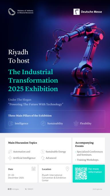 Riyadh, September 22, 2025, SPA -- The Ministry of Industry and Mineral Resources is preparing to organize the Industrial Transformation 2025 exhibition in the capital, Riyadh, from December 1 to 3, under the slogan "Empowering the Future with Technology."