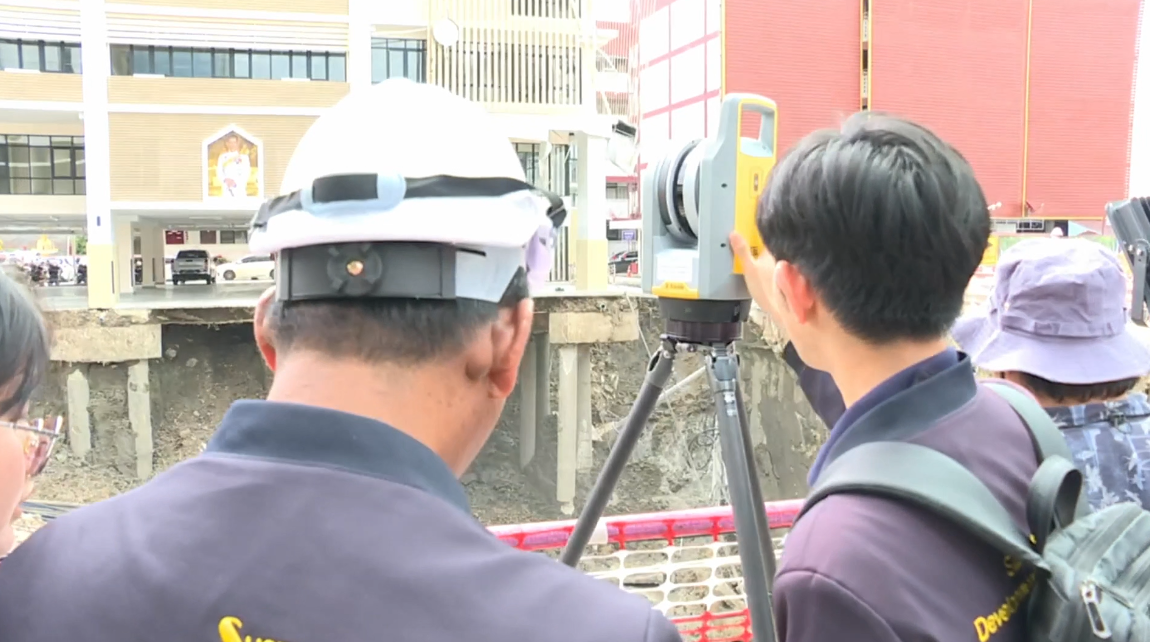 Safety concerns persist for the adjacent Samsen Police Station. The newly completed police station was scheduled to open next month before the sinkhole incident compromised its foundation. Engineers have deployed 3D laser scanning equipment to continuously monitor the building's movement and tilt. Officials are worried that utility cables and power lines currently pulling on the structure could induce collapse, prompting officials to consider cutting these cables to eliminate the strain. The detailed data from the 3D scans is critical for determining if the station building is safe to retain.