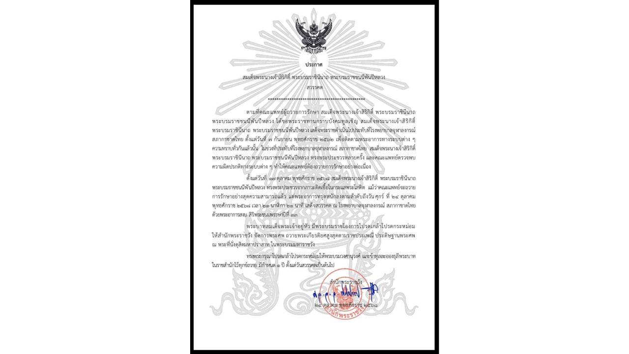 BANGKOK, Oct 25 (TNA) - Her Majesty Queen Sirikit The Queen Mother, the royal consort of Thailand’s late King Bhumibol Adulyadej, passed away on Friday at King Chulalongkorn Memorial Hospital in Bangkok at the age of 93, the Royal Household Bureau has announced.