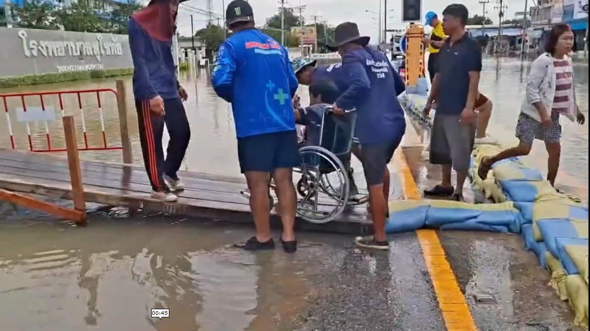 In Ang Thong, a dike breach caused renewed, high-level flooding around Pa Mok Hospital, forcing the evacuation of elderly and bedridden patients in what is the worst flood in the area in 36 years.