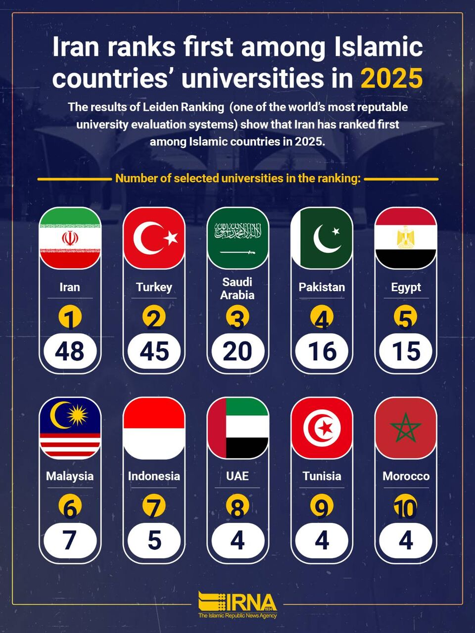 Tehran,IRNA-- According to the Leiden Ranking, Iran, with 48 universities included in this ranking system, maintains its first place among Islamic countries in terms of the number of universities, as in previous years. Following Iran, Turkey and Saudi Arabia hold the second and third positions with 45 and 20 universities respectively.