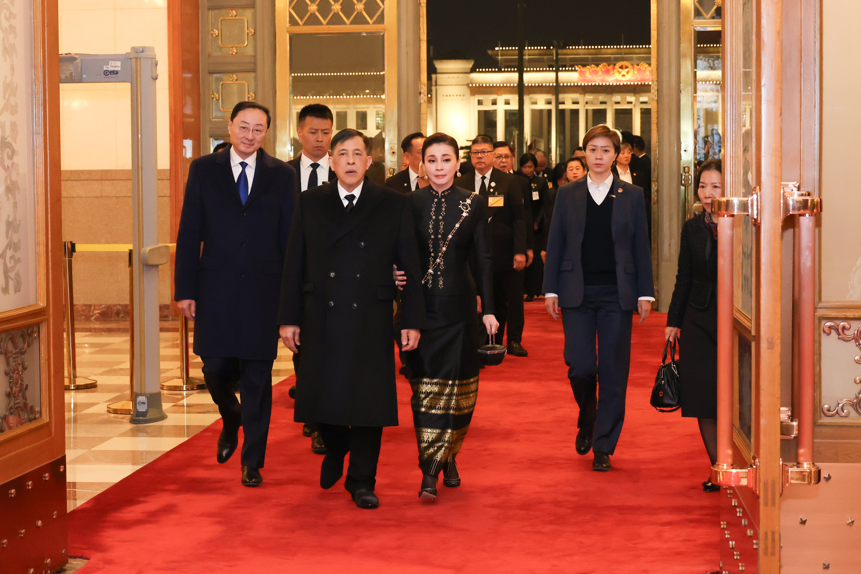 Their Majesties first paid respects in the Yuantong Hall to a large, Thai-style gilt-bronze Buddha image, presented by a former Supreme Patriarch of Thailand in 1990, symbolizing the long-standing Buddhist ties between the nations.