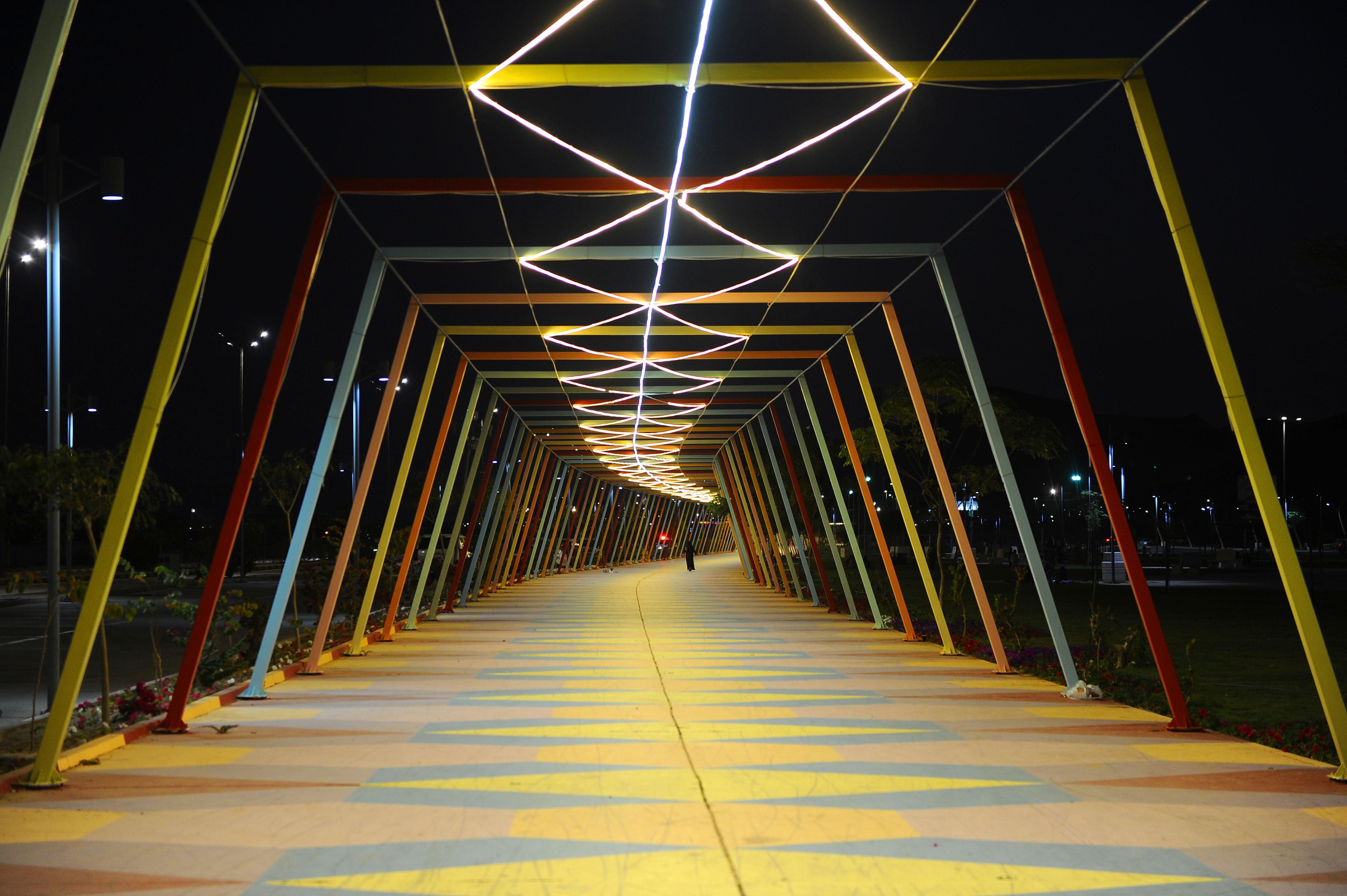 The walkway is located within Prince Jalawi bin Abdulaziz Park in Aba Rashash. It extends 600 meters in length and 10 meters in width, and features central green areas that blend harmoniously with the park’s total area of 2,180,765 square meters. The developed area covers 520,124 square meters and includes urban zones designated for walking and recreation, alongside expanded landscaping that includes more than 8,100 diverse trees, adding natural beauty to the site.